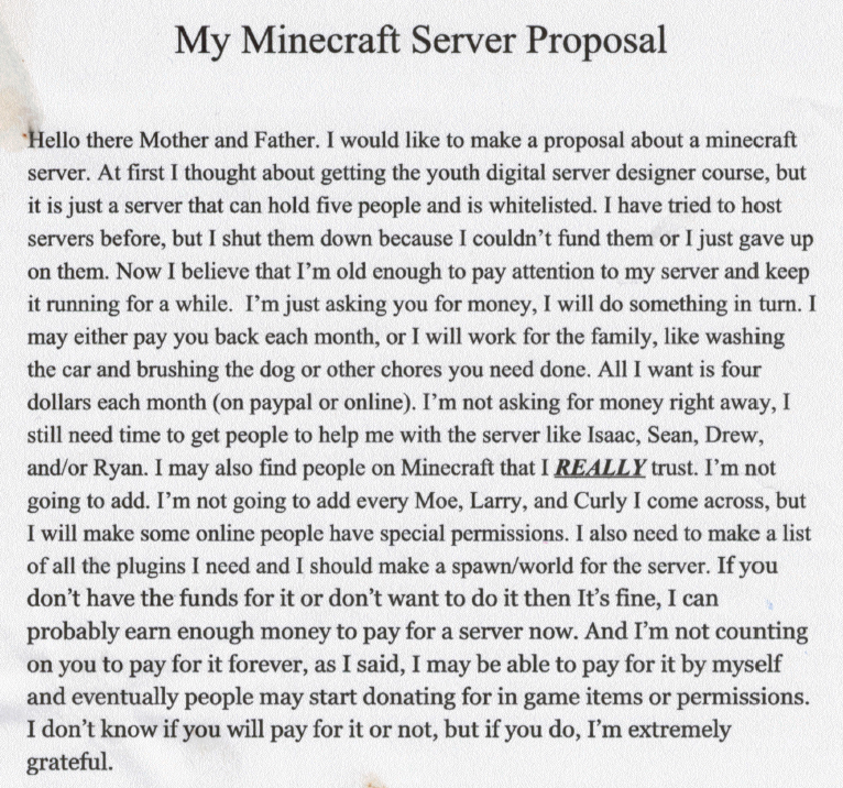 I’m pretty proud of my son, who’s 13 years old and in 8th grade. He came to me a few weeks ago and said, “Mom, I want to start a Minecraft server again.” He gave me a bit of background, and said he’d do work in exchange for me and his dad paying the server fees – just under $5.00 per month. We talked about it, and I asked why would this time be different to last time he had a server, which he abandoned in the end, etc.). My son had some decent answers, so I asked him to write it up into a proposal for me.